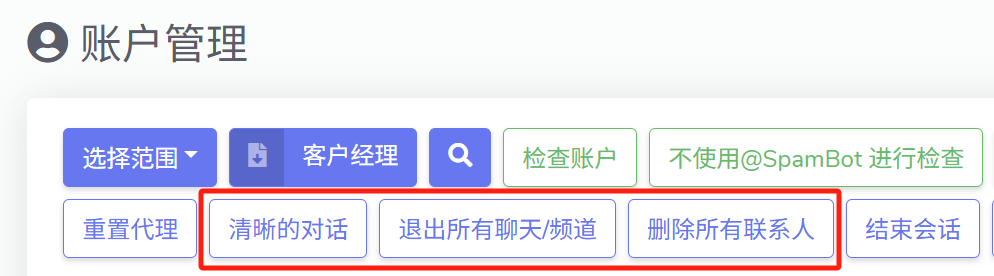 | **退出所有群组和频道** | 将账号退出其已加入的所有群组和频道，适合账号“清群”重启 |
