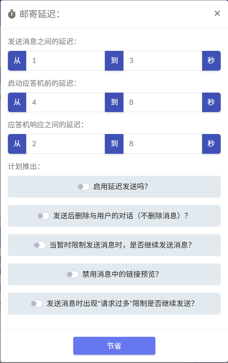 | **发送延迟区间**                | 设置每条消息发送间隔（如2-5秒之间，✅仅供参考，实际需测试调整）。 |
