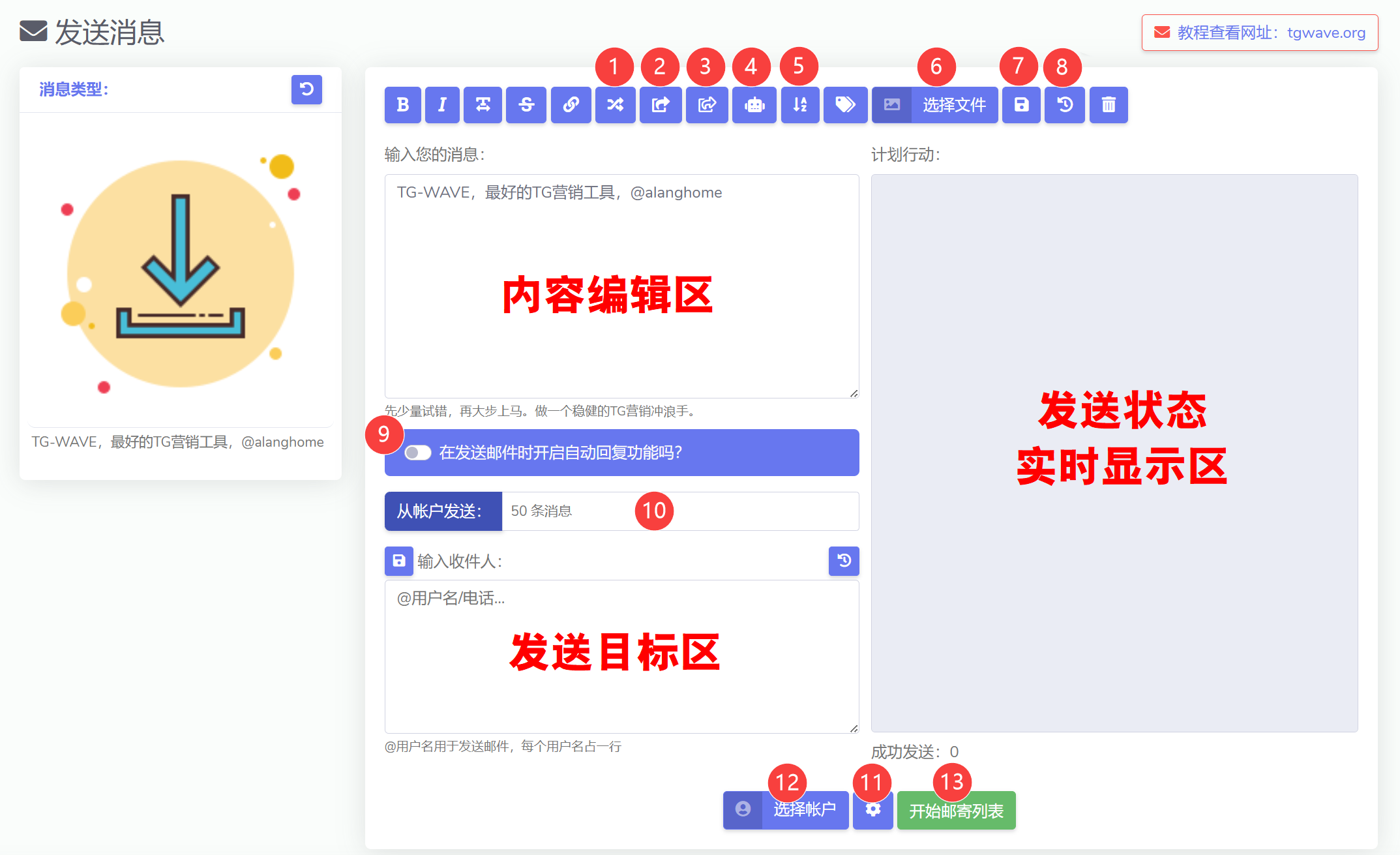 | **内容编辑区**              | 编辑要发送的文本内容，可插入链接、随机化变量、隐藏来源转发、发送文件等。 |