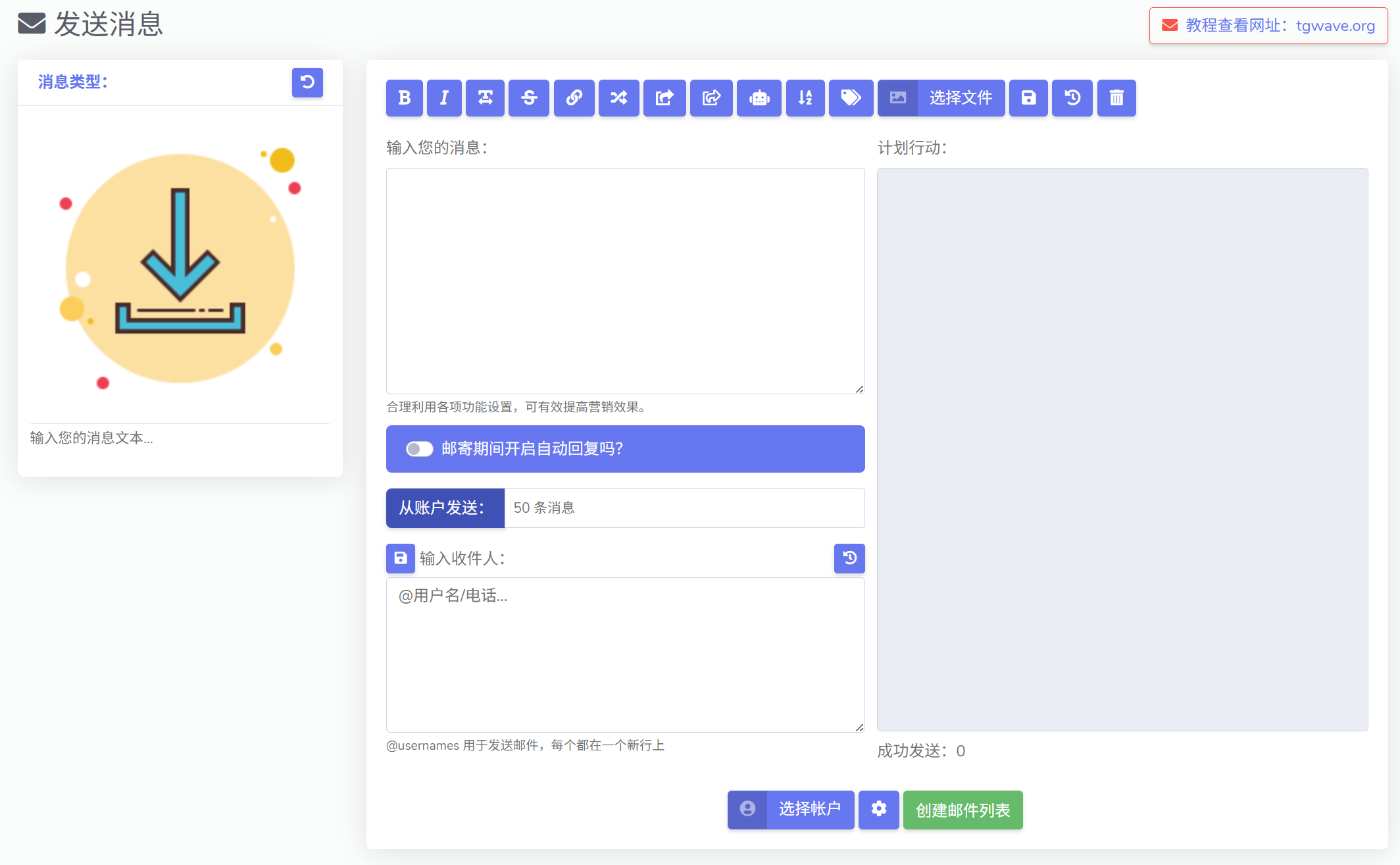 **【发送消息】**&#x662F; TG-WAVE 中最基础的私信模块，支持向一批用户名或手机号用户发送私信内容，可自定义内容格式、话术形式、延迟参数，并可选择是否启用答录机自动回复。