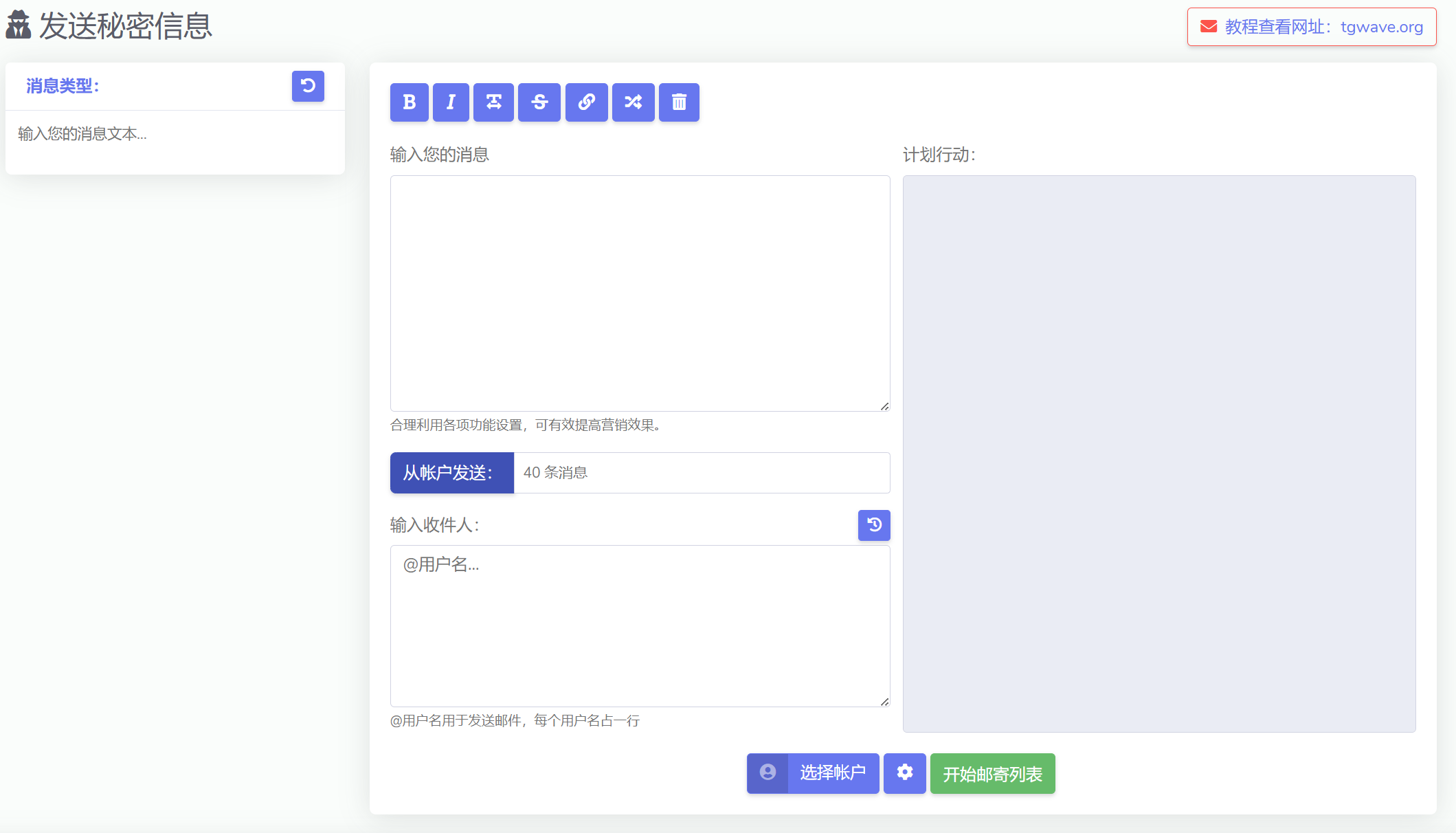 <figure><img src="https://content.gitbook.com/content/egNivsKwUmWxsm9f6cgR/blobs/NyYUZ5vn8PE2IKt3sX6g/image.png" alt=""><figcaption><p>TG-WAVE秘密消息操作界面</p></figcaption></figure>