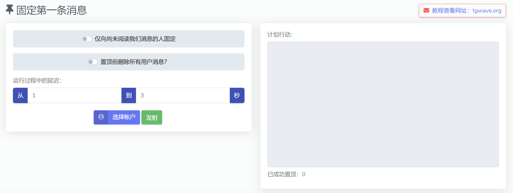 | 延迟设置（随机范围）  | 设置每条消息发送与置顶之间的延迟（单位：秒），如 1～3 秒，防风控 |