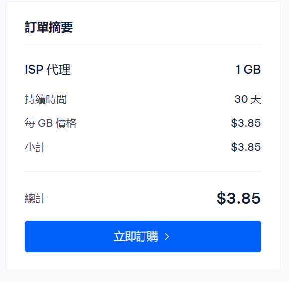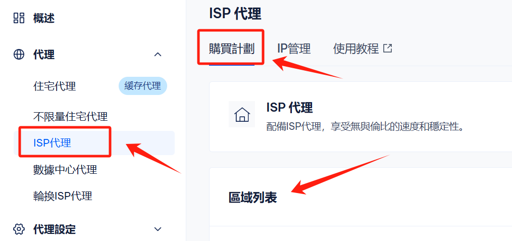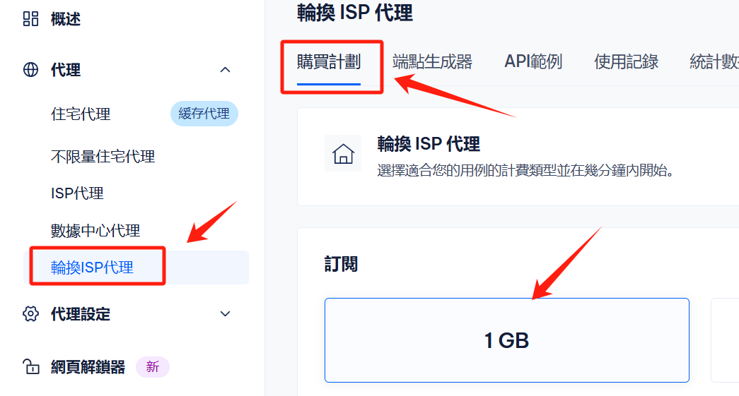 <figure><img src="https://content.gitbook.com/content/egNivsKwUmWxsm9f6cgR/blobs/l9dCYqe2OUdI2RVKhL9X/1744971432722.png" alt=""><figcaption><p>选择左侧轮换ISP代理，点击购买计划，初始可选择1GB流量测试</p></figcaption></figure>