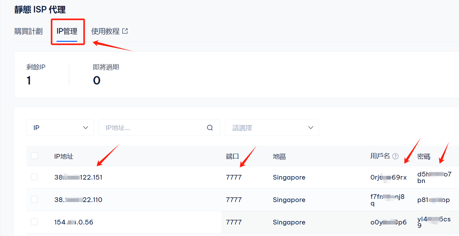 <figure><img src="https://content.gitbook.com/content/egNivsKwUmWxsm9f6cgR/blobs/P4Wqi3ueGYdPy2K1qT95/1744972384734.png" alt="" width="563"><figcaption><p>购买成功后，在【IP管理】能看到IP、端口、用户名、密码</p></figcaption></figure>