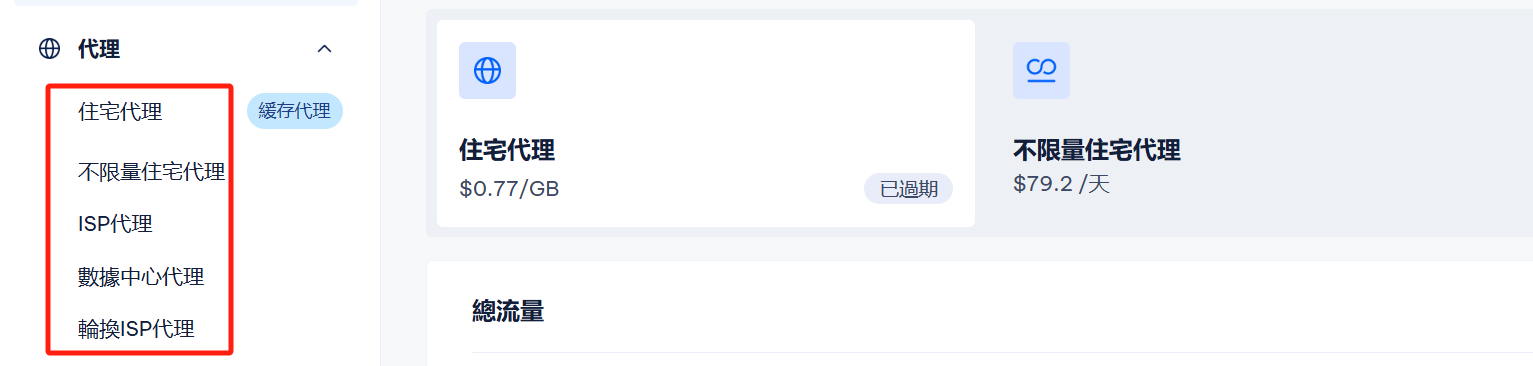 <figure><img src="https://content.gitbook.com/content/egNivsKwUmWxsm9f6cgR/blobs/smH7Laldqx6vEim9Mu8g/1744972065688.png" alt=""><figcaption><p>后台界面左侧选择购买的IP类型</p></figcaption></figure>