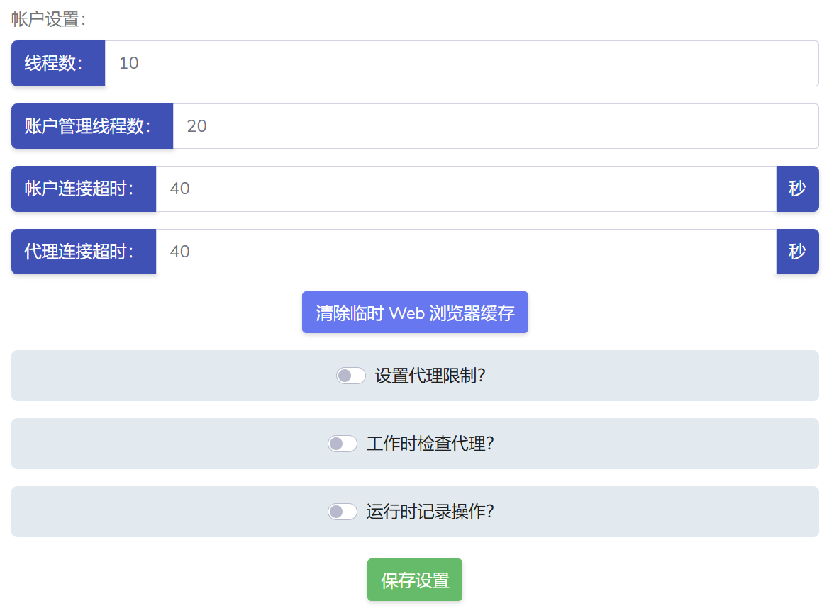 <table><thead><tr><th width="162.333251953125">参数项名称</th><th width="89.6666259765625">默认值</th><th>参数说明</th></tr></thead><tbody><tr><td><strong>账号操作线程数</strong></td><td><code>5</code></td><td>控制每个功能模块中同时运行的账号数量（并发线程）</td></tr><tr><td><strong>账号管理线程数</strong></td><td><code>20</code></td><td>控制【账号管理模块】中同时运行的账号数（导入/检测/筛活等）</td></tr><tr><td><strong>账号连接超时时间</strong></td><td><code>150</code> 秒</td><td>每个账号尝试连接的最大时间，超出将跳过该账号</td></tr><tr><td><strong>代理连接超时时间</strong></td><td><code>40</code> 秒</td><td>每个代理连接 Telegram 的最大等待时间</td></tr></tbody></table>