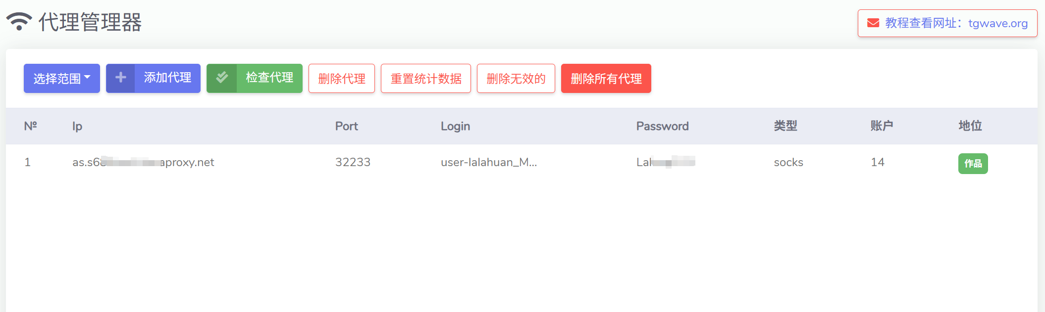 | **账户**       | 绑定此代理的账号数量        |